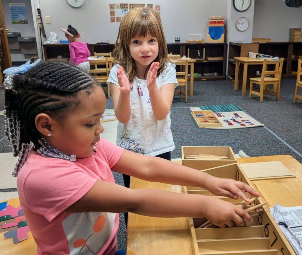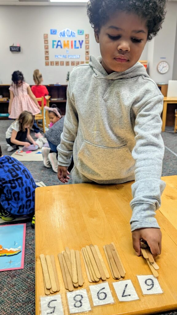 She is working on a Math material called the Spindle Box. The Montessori spindle box is a hands-on math material designed to help children associate numerals with their corresponding quantities. Its main purposes include teaching the concept of zero, reinforcing number-quantity correspondence for numbers