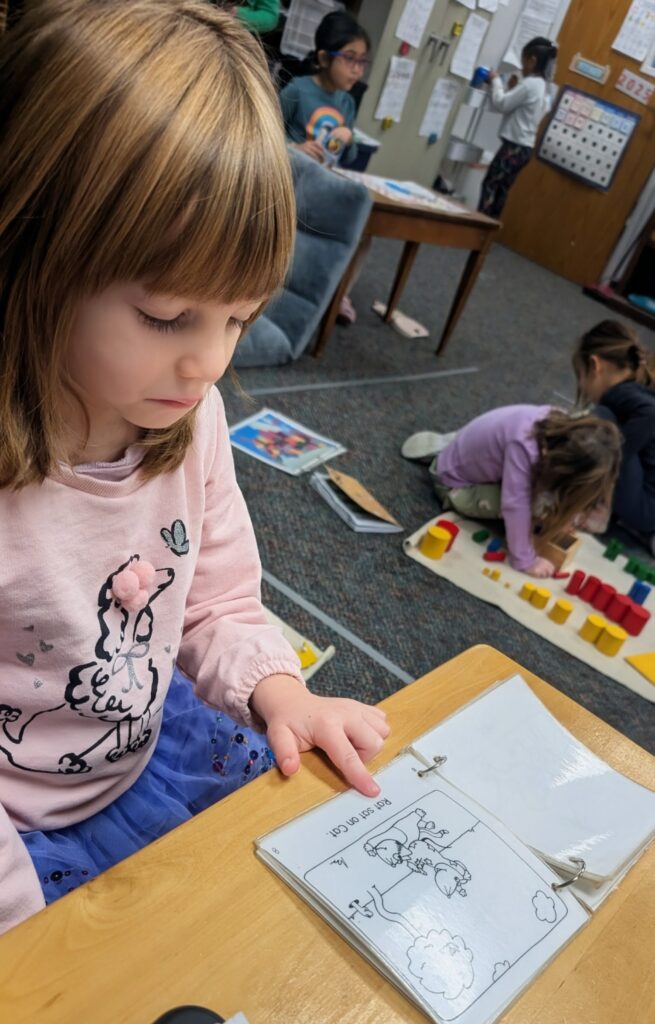 She is working on the Knobless Cylinders. The purpose of Montessori knobless cylinders in a “matching” context is to develop a child’s capacity for visual discrimination of dimensions, such as height and diameter, by requiring them to independently identify and order cylinders from thickest to thinnest or shortest to tallest. This challenges the child to use their own judgment rather than a physical knob or slot, fostering concentration, independence, and spatial awareness.